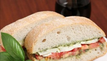 Чиабатта с яйцом, творожным сыром, свежими помидорками и песто алла дженовезе