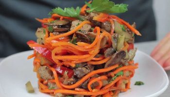 Яркий, сочный и вкусный салат с куриной печенью и морковью по-корейски