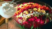 Сегодня у меня был салат по-грузински, потому что готовила из холодного картофеля, который отваривала накануне. Да и вместо кинзы взяла зелёное ассорти из сельдерея, базилика, петрушки и укропа.