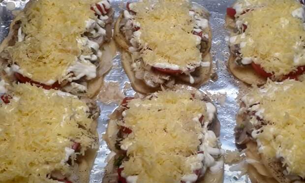 Ингредиенты: 600 граммов картофеля, 2 репчатых луковицы, 300 граммов грибов, 2 помидора, 100 граммов любого твердого сыра, 100 граммов сметаны (ее мы смешаем с ложкой горчицы), соль, укроп и перец.